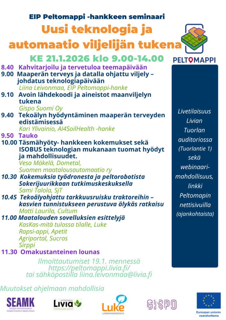 Tapahtuman toteuttavat Ammattiopisto Livia, Seinäjoen AMK, Luke ja Gispo Oy Euroopan unionin osarahoittaman EIP Peltomappi -hankkeen puitteissa.