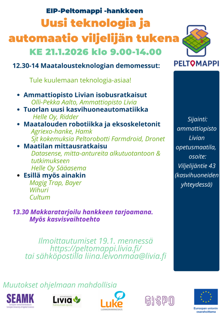 Miten moderni teknologia ja automaatioratkaisut voivat helpottaa viljelijän arkea ja parantaa tuotannon tehokkuutta kasvintuotannossa? Tulee mukaan kuuntelemaan seminaaria 21.1.2026 klo 9-14 Ammattiopisto Livian tiloihin Kaarinan Tuorlaan. Tapahtumaan on mahdollista osallistua myös etänä (linkki webinaariin päivitetään tälle sivulle ennen tapahtuman alkua ja lähetään kaikille ilmoittautuneille. Tapahtuma on avoin ja maksuton kaikille kiinnostuneille!